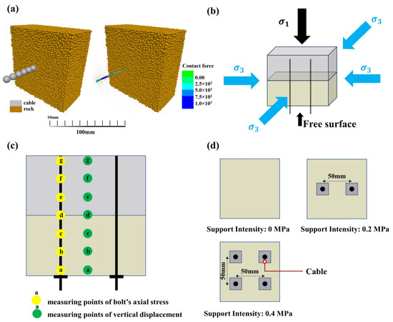 To investigate the failure process of LCR after roadway excavation and stress release, a triaxial loading model with five confined boundaries was established, as illustrated in Figure 2b. The model was loaded in three orthogonal directions, with one side left as a free surface. The confining stresses were servo-controlled at 10 MPa, 15 MPa, and 20 MPa to represent different in situ stress levels. After reaching the target stresses, the wall at the free surface was removed, and loading along the σ1 direction was continued, while the other two directions maintained their servo-controlled conditions. During the loading process, both the vertical displacement inside the model and the axial stress within the bolts were recorded. The monitoring locations are indicated in Figure 2c.