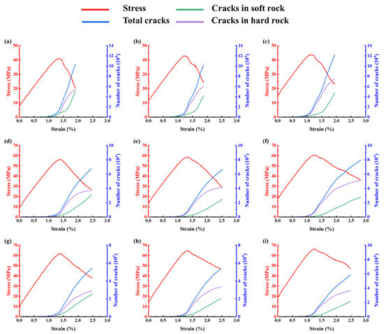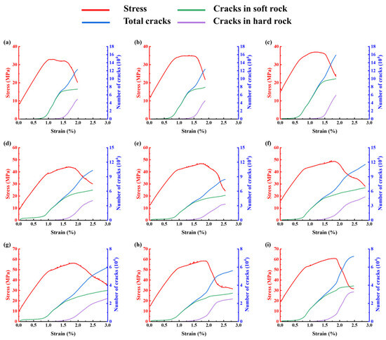 Stress–strain curves and crack evolution of the LCR under hard rock free surface conditions: (a) support intensity = 0 MPa, σ3 = 10 MPa; (b) support intensity = 0 MPa, σ3 = 15 MPa; (c) support intensity = 0 MPa, σ3 = 20 MPa; (d) support intensity = 0.2 MPa, σ3 = 10 MPa; (e) support intensity = 0.2 MPa, σ3 = 15 MPa; (f) support intensity = 0.2 MPa, σ3 = 20 MPa; (g) support intensity = 0.4 MPa, σ3 = 10 MPa; (h) support intensity = 0.4 MPa, σ3 = 15 MPa; (i) support intensity = 0.4 MPa, σ3 = 20 MPa.