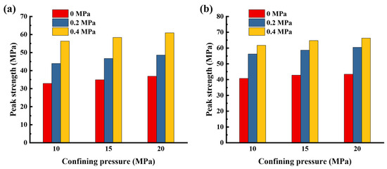 The influence of support intensity on the peak stress of fully bonded, cross-layer anchored LCR is shown in Figure 5. The deformation control effect of the bolts is more pronounced in soft rock than in hard rock. As a result, reinforced LCR with a soft rock free surface exhibits a greater enhancement in strength. At a support intensity of 0.4 MPa, the average increase in peak stress for soft rock free surface samples was 70.2%, while for hard rock free surface samples, it was 51.2%.