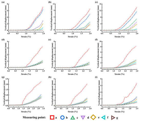 Vertical displacement distribution curves of the LCR under soft rock free surface conditions: (a) support intensity = 0 MPa, σ3 = 10 MPa; (b) support intensity = 0 MPa, σ3 = 15 MPa; (c) support intensity = 0 MPa, σ3 = 20 MPa; (d) support intensity = 0.2 MPa, σ3 = 10 MPa; (e) support intensity = 0.2 MPa, σ3 = 15 MPa; (f) support intensity = 0.2 MPa, σ3 = 20 MPa; (g) support intensity = 0.4 MPa, σ3 = 10 MPa; (h) support intensity = 0.4 MPa, σ3 = 15 MPa; (i) support intensity = 0.4 MPa, σ3 = 20 MPa.