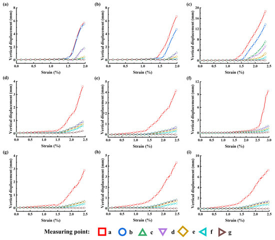 Vertical displacement distribution curves of the LCR under hard rock free surface conditions: (a) support intensity = 0 MPa, σ3 = 10 MPa; (b) support intensity = 0 MPa, σ3 = 15 MPa; (c) support intensity = 0 MPa, σ3 = 20 MPa; (d) support intensity = 0.2 MPa, σ3 = 10 MPa; (e) support intensity = 0.2 MPa, σ3 = 15 MPa; (f) support intensity = 0.2 MPa, σ3 = 20 MPa; (g) support intensity = 0.4 MPa, σ3 = 10 MPa; (h) support intensity = 0.4 MPa, σ3 = 15 MPa; (i) support intensity = 0.4 MPa, σ3 = 20 MPa.
