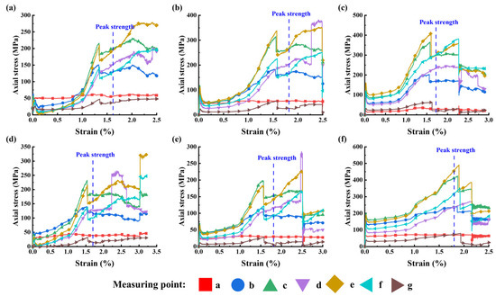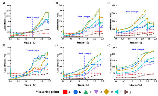 The evolution of bolt axial stress under soft-rock-free-surface conditions is presented in Figure 8. The monitoring points a–g in Figure 8 and Figure 9 correspond to the measurement points shown in Figure 2c. Before the specimens reached peak stress, the axial stress of the fully grouted bolts increased gradually and then rose sharply. The stress distribution along the bolts reflects the current load-bearing state of the anchorage system. Once deformation tendencies arise within the rock mass, the fully grouted bolts immediately sense the load through the anchorage interface and develop resistance. Thus, increasing axial stress indicates that the interface at that location is actively bearing and transmitting load. The position of the maximum axial stress along the bolt can therefore be regarded as the current load-bearing core of the anchorage system.