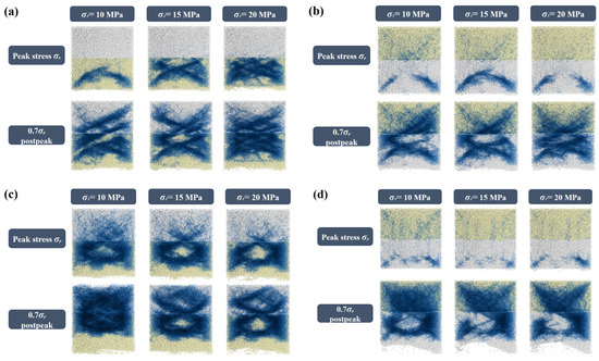 Figure 10a shows the crack development in the unsupported LCR model under soft-rock-free-surface conditions. Failure first developed in the soft rock at the free surface and along layer interfaces, while the hard rock remained intact. Under compressive loading, the central portion of the specimen bulged outward toward the free surface, initiating shear cracks at both upper corners. These eventually connected with central tensile cracks to form a crescent-shaped dominant fracture surface. The rock bounded by this surface tended to detach and spall. As confining pressure increased, crack propagation in the free-surface soft rock intensified, and multiple secondary cracks developed in addition to the dominant one. In the post-peak stage, cracks began to initiate and propagate within the hard rock. When the stress dropped to 75% of the peak load, the soft rock exhibited X-shaped conjugate fractures, while the hard rock developed multiple oblique shear fractures, some of which penetrated both soft and hard layers. These nearly parallel shear planes reflected the progressive failure process from shallow to deep. After shallow portions detached, the load was transferred to deeper strata, where new shear fractures gradually formed. This cycle repeated until complete failure, leaving a series of parallel oblique shear planes.