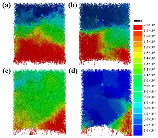 Particle velocity vector field of the LCR under 20 MPa confining pressure: (a) soft rock free surface, support intensity = 0 MPa; (b) hard rock free surface, support intensity = 0 MPa; (c) soft rock free surface, support intensity = 0.4 MPa; (d) hard rock free surface, support intensity = 0.4 MPa.