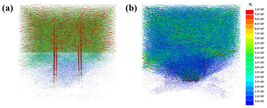 To balance modeling precision and computational efficiency, the particles surrounding the bolts were not regrouped into a distinct anchorage medium. Instead, anchorage was achieved by explicitly defining contact interactions between the bolt particles and the surrounding rock particles. A custom Fish function was written to identify these contacts and assign mechanical properties according to the lithology of the adjacent rock particles. A pre-tension load of 1 kN was applied to the end particle of each bolt, and the resulting pretension diffusion effect is shown in Figure 2a.