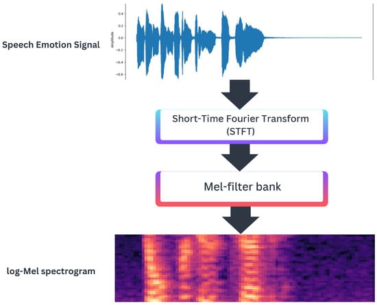 - To improve clarity and retain essential emotional cues, the raw audio signals are processed through log-Mel spectrogram conversion and normalization [20,21]. This preprocessing step minimizes the impact of environmental noise while ensuring the retention of the most relevant emotional features in the speech signal.