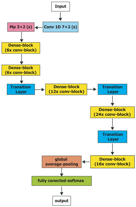 Downsampling the feature maps and enabling the flow between dense blocks depends critically on the transition layer. First, the input x undergoes a convolution block that halves the last dimension of the input, so lowering the number of filters. This method preserves pertinent features while helping to lower the computational load. Then, x undergoes an average pooling operation (Avg Pool 1D), with a pool size of 2, a stride of 2, and padding set to “same”. This pooling process preserves significant information while down-sampling the feature map, so lowering its spatial dimensions.