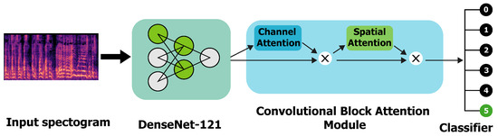 The extracted features are subsequently refined through the use of the CBAM. CBAM integrates two distinct attention mechanisms: the channel attention mechanism, which emphasizes the most informative feature channels, and the spatial attention mechanism, which identifies and prioritizes the most significant regions within the feature map. Once enhanced, the refined feature map is forwarded to the classifier, which assigns a label to the input. By combining DenseNet-121 with CBAM, the model’s capacity to focus on the most pertinent audio features is significantly improved, resulting in more precise and accurate classifications.