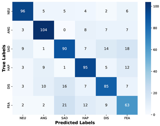 Recent ASER research also explores semi-supervised methods to enhance model fairness. Ref. [30] utilizes pseudo-labeling and unsupervised clustering to infer demographic attributes, aiming to mitigate performance disparities across subgroups without requiring explicit demographic labels. While this approach improved fairness metrics on the CREMA-D dataset, it contrasts with our fully supervised method, which focuses directly on emotion classification using the provided emotional labels. This direct optimization on ground-truth annotations explains the high accuracy achieved (82%) on the primary classification task.