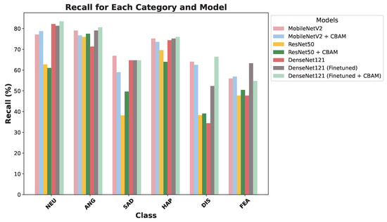 In terms of general accuracy and recall, the combination of DenseNet121 fine-tuned with CBAM beats all other architectures, according to the analysis shown in Table 6 and Figure 8. This model is especially fit for real-world emotion classification tasks since the recall improvements—especially for Class 4 (Dis) and Class 5 (FEA)—are rather significant. Previously difficult for the baseline model, DenseNet121 fine-tuned with CBAM can concentrate on important features that support the recognition of subtle emotional expressions, so validating it as our proposed model. Different from other models, this model unequivocally shows that CBAM is essential for enhancing the performance of DenseNet121, so confirming the need for including attention mechanisms in deep learning architectures.