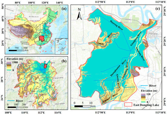 (a) Geographical location of Hunan Province; (b) geographical position of East Dongting Lake; (c) elevation and river system of East Dongting Lake.