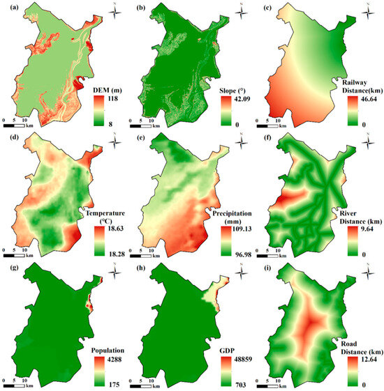 Rasterization of driving factors: (a) DEM; (b) slope; (c) railway distance; (d) temperature; (e) precipitation; (f) river distance; (g) population; (h) GDP; (i) road distance.