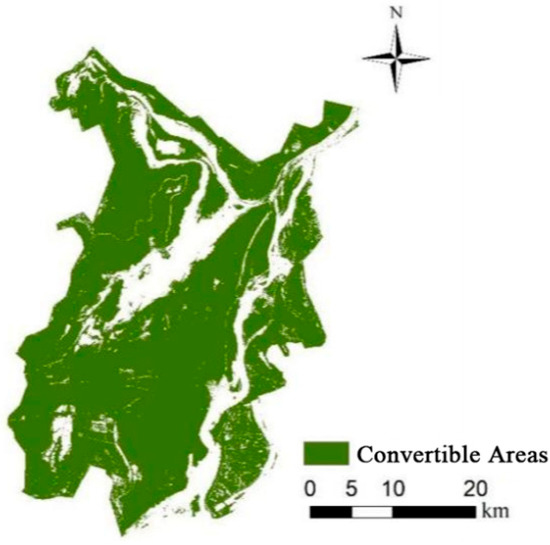 Certain policies impose restrictions on changes to designated wetland types, such as open water areas and specific nature reserves. Based on the ecological protection policies of East Dongting Lake, water body areas were extracted from the 2022 land use data and converted into a binary constraint map with values of 0 or 1. In this map, a value of 0 indicates that conversion is prohibited, while a value of 1 indicates that conversion is permitted. Under this assumption, water bodies cannot convert into other wetland types, while poplar plantation land, grassland, and mudflats are eligible for conversion. Therefore, before performing the CARS operation, water bodies were separated from other areas within the study region and loaded into the PLUS model to generate a map of convertible areas (Figure 3).