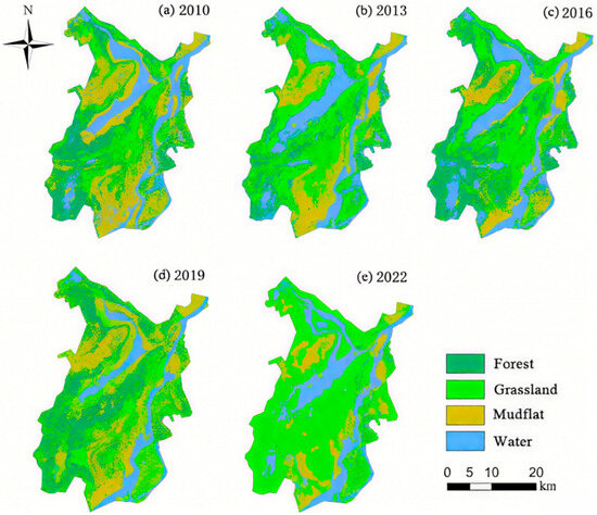 Understanding the direction of landscape pattern evolution and its driving factors is essential for optimizing regional landscapes and ensuring the coordinated development of ecology and socioeconomics. To examine the spatial distribution of wetland landscape types in East Dongting Lake, a supervised classification method using Random Poplar Plantations was applied to classify data from five time periods between 2010 and 2022, with data collected every three years (Figure 2).