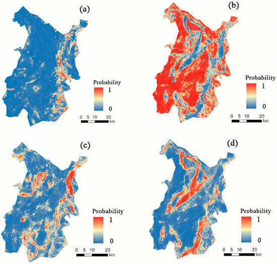 Transition probability of wetland types: (a) poplar plantations; (b) grassland; (c) mudflats; (d) water.