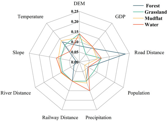 The contributions of driving factors to the expansion of grassland for each period from 2010 to 2022 are summarized in Figure 6. Based on the analysis of Figure 5 and Table 4, it can be concluded that between 2010 and 2022, precipitation contributed the most to the expansion (or contraction) of water, followed by DEM. While road proximity was identified as the dominant spatial determinant of poplar plantation distribution patterns, the study period actually saw a dramatic net loss of poplar plantation cover. This apparent paradox can be explained by two key mechanisms: (1) the model’s driving factor analysis captures intrinsic landscape suitability—residual poplar plantation patches showed strong spatial association with road networks, reflecting historical plantation management practices; (2) these natural spatial patterns were subsequently overridden by systematic ecological restoration policies implemented during the study period. The top three contributing factors to grassland expansion were DEM, river distance, and precipitation (Figure 7). The two most influential factors in mudflat expansion were precipitation and temperature. Overall, the primary factors influencing the expansion or contraction of each wetland type were precipitation, DEM, river distance, temperature, and road distance. This suggests that natural factors primarily drive wetland changes in the study area, with human activities being mainly influenced by road distance.