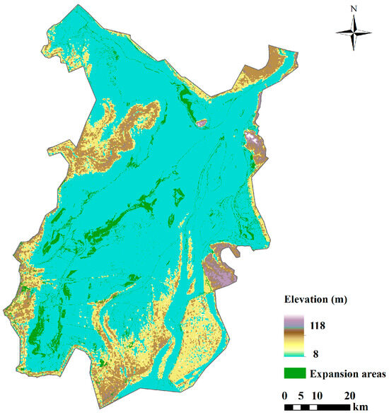 Further overlay analysis of the grassland expansion area with the elevation data of the study area (Figure 8) reveals that grasslands are primarily concentrated in lower elevation, flat areas. During this period, grasslands expanded not only in low-elevation mudflat areas but also into forested areas. This expansion is primarily driven by large-scale deforestation, demonstrating that human regulatory activities can influence and even control wetland changes in the region.