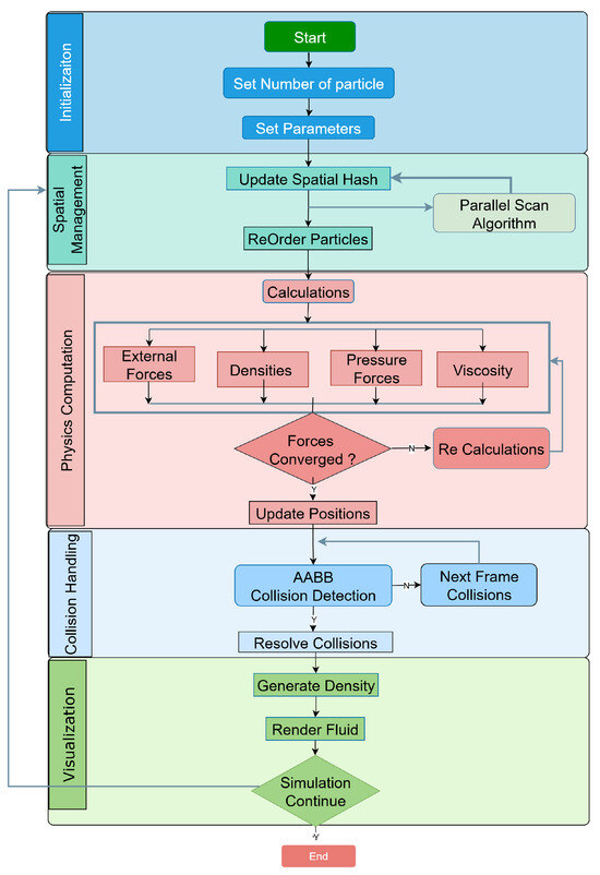 As shown in Figure 1, our implementation follows a structured pipeline from initialization through spatial management, physics computation, collision handling, and visualization. Each component is implemented as a separate compute shader kernel to maximize parallel execution efficiency while minimizing data transfer between CPU and GPU.