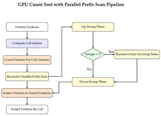 Of particular relevance to large-scale particle simulations, Jambunathan and Levin [38] presented a linear space-filling Morton Z-curve algorithm for organizing three-dimensional octrees in linear arrays. Their approach implements load-balanced domain decomposition to efficiently process large-scale simulation data by partitioning the octree structure into manageable chunks for sequential GPU processing. By retaining only leaf nodes in the linear array and discarding interior nodes, their method reduces memory requirements and focuses computational resources on relevant data regions. This approach minimizes costly global memory access patterns by leveraging shared memory within thread blocks and implementing dynamic load balancing that optimizes both memory usage and processing throughput. The technique ensures each GPU thread processes small data chunks while traversing the octree structure simultaneously, executing identical instruction sets to minimize computational divergence and maximize parallel efficiency.