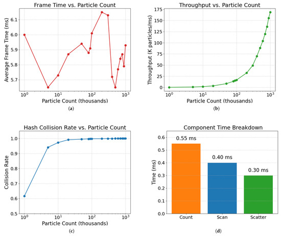 Total frame time exhibits remarkable stability at approximately 4.0 ms regardless of particle count, with particularly narrow confidence intervals at higher particle counts (±2–4% relative uncertainty). This demonstrates the effectiveness of our GPU-accelerated approach in maintaining consistent performance across varying computational loads. The throughput scales nearly linearly with particle count, achieving 250,835 ± 5846 particles/ms for the 1 M particle configuration, representing a coefficient of variation of only 2.3%.