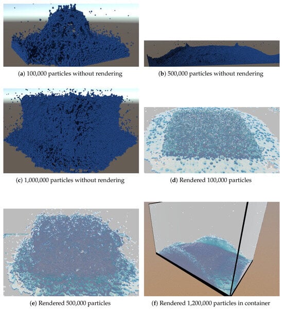 To thoroughly demonstrate our method’s capabilities across different scales and visualization techniques, Figure 9 presents a comprehensive view of our simulation results across varying particle counts and rendering approaches. The temporal evolution visible across these images demonstrates how our method maintains consistent physical behavior while scaling to different particle counts. The initial splash dynamics (a,d) evolve into complex wave patterns (b,e) and eventually develop into fine-grained fluid dynamics (c) and realistic fluid–boundary interactions (f). This progression validates our simulation’s ability to capture the full range of fluid behaviors over time, from the high-energy initial impact to the subtle surface tension effects in later stages.