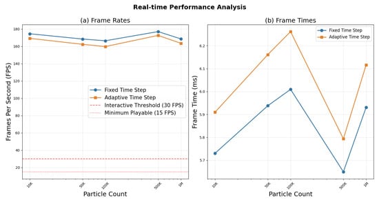 Real-time performance analysis. (a) Frame rates achieved with different particle counts using fixed versus adaptive time stepping. (b) Frame times in milliseconds for both stepping methods.