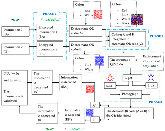 The methodological approach is structured in three main phases: encryption of the information (EA and EB) using dichromatic QR codes (A and B), generation of a chromatic QR code (C) by superimposing the two dichromatic QR codes, and recovery of each dichromatic code through color-based identification techniques using a photograph, as illustrated in Figure 1.