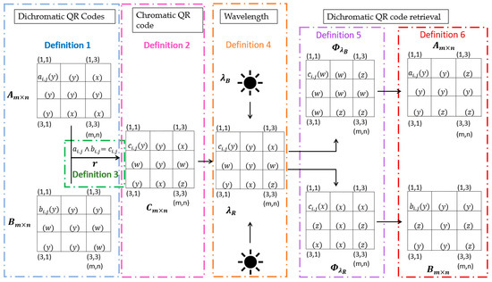 With two dichromatic QR codes, these being matrix and matrix , it is possible to obtain a chromatic code by a multiplexing relation; this is expressed in Definition 2 and Definition 3.