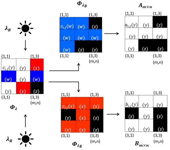 For every absorption or reflection, the result is obtained from a spectral transformation T of an image , such that each element , with y, z ∈ {0, 1}, where 1 denotes reflection and 0 denotes absorption.