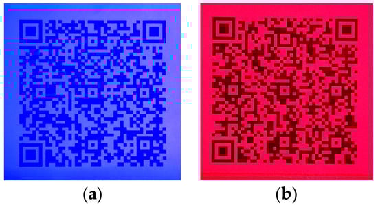 According to Definition 4, when blue-wavelength light is projected onto code , code becomes visible, whereas projecting red-wavelength light onto the same code reveals code . Photographs of each code were taken during the process, as illustrated in Figure 6.