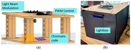 For this case study, an experimental system was employed, consisting of a lightbox that integrates an STM32 board for precise control of the wavelengths, along with a modulation circuit responsible for regulating the duty cycle and frequency of each light beam. This setup ensures reliable identification of the dichromatic QR codes, allowing each color to be detected and recovered independently. Figure 9 provides a detailed view of the system: in (a), the schematic design of the lightbox is shown, highlighting the internal arrangement of the components, while in (b), the constructed prototype is displayed, illustrating its external appearance and the complete integration of the control hardware.