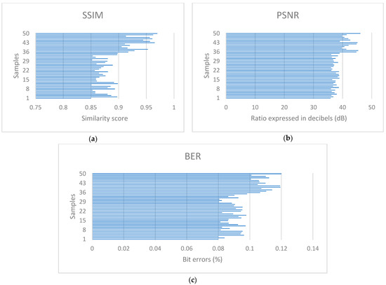 To validate the proposed method quantitatively, a total of 50 samples were evaluated under controlled capture and processing conditions. The metrics employed were the Structural Similarity Index Measure (SSIM), the Peak Signal-to-Noise Ratio (PSNR), and the Bit Error Rate (BER).