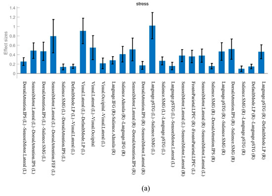 The FC observed in both the stress and recovery conditions was as follows: DorsalAttention.IPS (Left, L)—SensoriMotor.Lateral (L), SensoriMotor.Lateral (L)—DorsalAttention.IPS (L), Language.pSTG (L)—Salience.SMG (L), Salience.SMG (L)—Language.pSTG (L), SensoriMotor.Lateral (L)—SensoriMotor.Lateral (Right, R), SensoriMotor.Lateral (R)—SensoriMotor.Lateral (L), and DefaultMode.LP (R)—Language.pSTG (R) (Figure 1). When we compared the effect sizes of these FCs, most showed a larger effect size after stress induction than during the recovery phase (Figure 2). In particular, the connectivity in Language.pSTG (L)—Salience.SMG (L) showed more than double the effect size in the stress phase compared with that in the recovery phase (Figure 2).