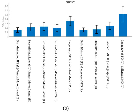 The networks observed only in the recovery phase were the Language.pSTG (R)—DefaultMode.LP (R) and DefaultMode.LP (R)—Visual.Lateral (R) (Figure 1).