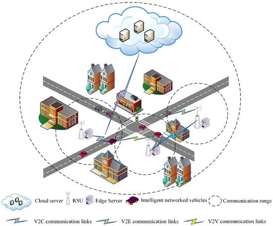 The application of cloud–edge collaboration technology in vehicular network systems can significantly enhance resource utilization and improve the user experience [13]. The study in [14] incorporates a caching system into the task execution process to address the issue of resource waste caused by redundant computations. By decomposing tasks into several subtasks, the study adopts a clustered edge server layout strategy and proposes a multi-intelligence deep reinforcement learning (MADRL) algorithm for edge–cloud collaboration. This approach optimizes the placement relationship between vehicle applications and edge servers, improving the utilization of computing resources in the vehicle. The work in [15] investigates a dynamic resource allocation scheme for various tasks, formulating an optimization problem to minimize the average task delay for cloud–edge collaboration offloading under long-term constraints related to energy consumption and system cost. The work in [16] focuses on the problem of joint task offloading, scheduling, and resource allocation in an MEC-enabled vehicle edge network (VEN), where vehicles can offload tasks to edge/cloud servers via vehicle-to-infrastructure (V2I) links or to other end-vehicle links via vehicle-to-vehicle (V2V) links. The work in [17] proposes a layered framework that improves the utilization of server resources and the satisfaction of vehicle service by formulating joint resource allocation and task load problems. This stimulates horizontal and vertical collaboration among vehicles, VEC servers, and cloud servers to optimize resource allocation within VEC servers and balance offloading loads among them.