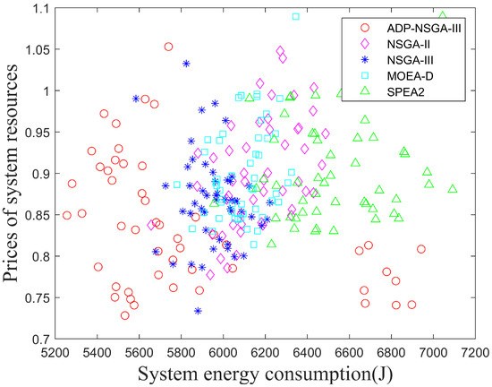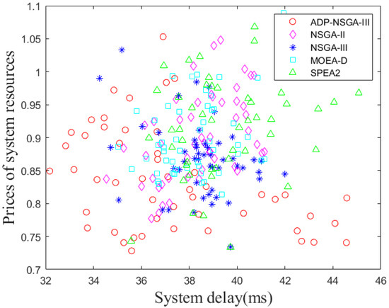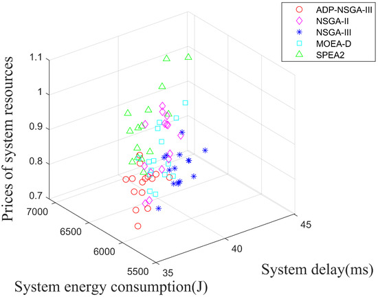 Figure 2 illustrates the population distribution of the optimal pricing effect of five optimization schemes on system delay, energy consumption, and edge system resources. As shown in Figure 2, the ADP-NSGA-III optimization scheme proposed in this paper demonstrates faster convergence and a more concentrated and uniform distribution of dominant solutions. This is due to the algorithm’s population division mechanism based on a partition strategy, allowing each subpopulation to focus on different regions, evolve independently, and promote information exchange between subpopulations. This approach reduces the risk of premature convergence and prevents the algorithm from falling into a local optimum. Therefore, it is argued that the ADP-NSGA-III optimization scheme is particularly well-suited for the cloud–edge–end collaboration scenario in telematics proposed in this paper.