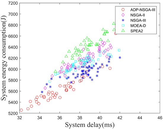 This experiment was conducted on a Windows 11 operating system using an Intel Core™ i7-14650HX processor and MATLAB (R2022b) for simulation. The algorithm parameters were set as follows: the random seed for the experiment was set to 42, the maximum number of iterations was 500, and the population size was 100. The comparison algorithms (NSGA-II, NSGA-III, MOEA/D, SPEA2) used the same population size and maximum iteration limit as the proposed algorithm, with all other parameters set according to their respective original papers. The proposed ADP-NSGA-III algorithm utilizes decimal encoding and incorporates reference vector dynamic adjustment (with a learning rate of 0.1) and distributed population management (with 6 subpopulations, a migration ratio of 0.1, and migration occurring every 5 generations). In the search process, constraint violation value-based tournament selection is employed for mating selection, differential evolution is used for mutation (with the mutation coefficient linearly decreasing from 0.9 to 0.1), binary crossover is applied (with the crossover probability quadratically decreasing from 0.9 to no less than 0.1), and polynomial mutation is performed (with a distribution index of 20). Environmental selection combines non-dominated sorting with niche preservation strategies to maintain the diversity and convergence of the solution set. We compare the ADP-NSGA-III optimization scheme proposed in this paper with the NSGA-II optimization scheme [27], the NSGA-III optimization scheme [24], the MOEA-D optimization scheme [28], and the SPEA2 optimization schemes [29,30] for comparison experiments. The comparison dimensions are mainly in terms of total system delay, system energy consumption, and optimal pricing of system resources, respectively. The parameters of the experiments designed in this paper are shown in Table 2.