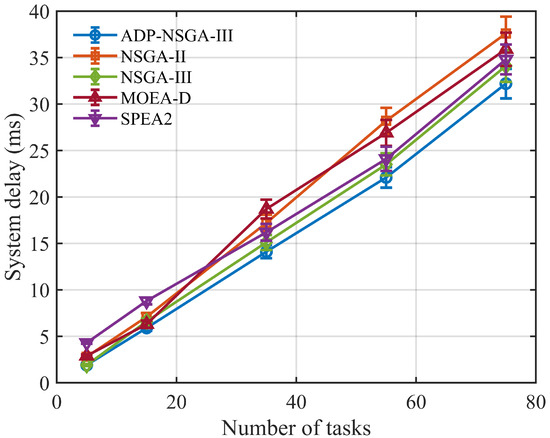 Figure 7 shows a comparison of system delay among different optimization schemes under varying task quantities (data represents the mean and standard deviation from 30 independent runs). As shown in the figure, system delay increases with the number of tasks. The proposed ADP-NSGA-III optimization scheme consistently achieves lower delay than other schemes, demonstrating a significant advantage. Specifically, when the system task count is 55, the ADP-NSGA-III delay is 22.10 ± 1.10, while the latencies of other schemes are as follows: NSGA-II is 28.20 ± 1.40, NSGA-III is 23.50 ± 1.20, MOEA-D is 26.90 ± 1.40, and SPEA2 is 24.10 ± 1.30. Compared to these schemes, ADP-NSGA-III reduces system delay by 21.63%, 5.96%, 17.84%, and 8.30%, respectively, when the number of tasks is 55. Therefore, the ADP-NSGA-III optimization scheme demonstrates a significant advantage in reducing system delay.