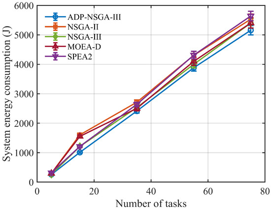 Figure 8 shows a comparison of system energy consumption among different optimization schemes under varying task quantities (data represents the mean and standard deviation from 30 independent runs). As shown in the figure, system energy consumption exhibits an upward trend as the number of tasks increases. The proposed ADP-NSGA-III optimization scheme consistently achieves lower energy consumption than other schemes, demonstrating a significant advantage. Specifically, when the system has 55 tasks, the energy consumption of ADP-NSGA-III is 3884 ± 116.5, while the energy consumption values of the other schemes are as follows: NSGA-II is 4407.1 ± 132.2, NSGA-III is 4202.5 ± 126.1, MOEA-D is 4601.3 ± 138.0, and SPEA2 is 4312.6 ± 129.4. Under this task quantity, the energy consumption of the ADP-NSGA-III scheme is reduced by 11.87%, 7.58%, 15.59%, and 9.94% compared to the NSGA-II, NSGA-III, MOEA-D, and SPEA2 schemes, respectively.