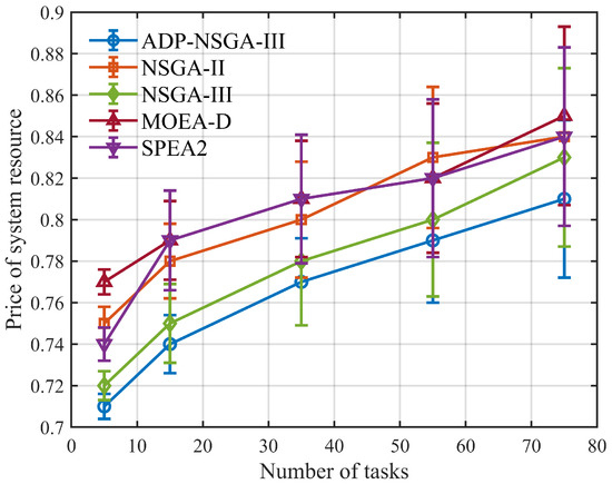 Figure 9 shows a comparison of system resource prices for different optimization schemes under varying task quantities (data represents the mean and standard deviation from 30 independent runs). As shown in the figure, system resource pricing exhibits an upward trend as the number of tasks increases. The proposed ADP-NSGA-III optimization scheme consistently achieves lower resource pricing than other schemes, demonstrating a significant advantage. Specifically, when the number of system tasks is 55, the resource pricing of ADP-NSGA-III is 0.79 ± 0.03, while the pricing of other schemes is as follows: NSGA-II is 0.83 ± 0.03, NSGA-III is 0.80 ± 0.03, MOEA-D is 0.82 ± 0.03, and SPEA2 is 0.82 ± 0.03. Under this task quantity, the resource pricing of the ADP-NSGA-III scheme is reduced by 4.82%, 1.25%, 3.66%, and 3.66% compared to the NSGA-II, NSGA-III, MOEA-D, and SPEA2 schemes, respectively.
