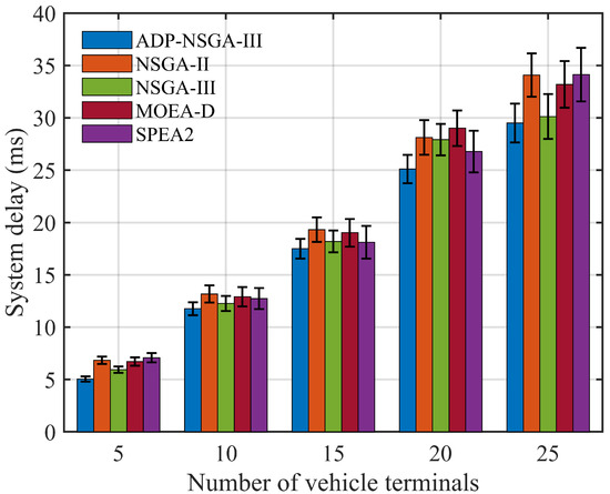 Figure 10 shows a comparison of system delay among different optimization schemes under varying numbers of vehicle terminals (data represents the mean and standard deviation from 30 independent runs). As shown in the figure, system delay increases with the number of vehicle terminals. The ADP-NSGA-III optimization scheme proposed in this paper consistently achieves lower delay than other schemes, demonstrating a significant advantage. Specifically, when the number of vehicle terminals is 25, the delay of ADP-NSGA-III is 29.50 ± 1.80, while the delays of other schemes are as follows: NSGA-II is 34.08 ± 2.00, NSGA-III is 30.12 ± 2.10, MOEA-D is 33.19 ± 2.20, and SPEA2 is 34.12 ± 2.50. Under this configuration, the ADP-NSGA-III scheme reduces system delay by 13.44%, 2.06%, 11.12%, and 13.54% compared to the NSGA-II, NSGA-III, MOEA-D, and SPEA2 schemes, respectively.