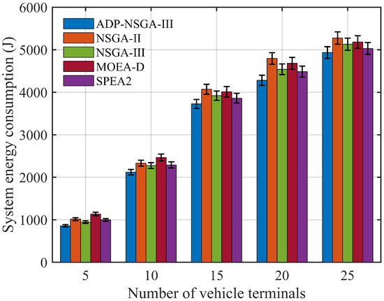 Figure 11 shows a comparison of system energy consumption among different optimization schemes under varying numbers of vehicle terminals (data represents the mean and standard deviation from 30 independent runs). As shown in the figure, system energy consumption increases with the number of vehicle terminals. The ADP-NSGA-III optimization scheme proposed in this paper consistently achieves lower energy consumption than other schemes, demonstrating a significant advantage. Specifically, when the number of vehicle terminals is 25, the energy consumption of ADP-NSGA-III is 4935 (±138), while the energy consumption values of other schemes are as follows: NSGA-II is 5275 (±145), NSGA-III is 5130 (±142), MOEA-D is 5180 (±150), and SPEA2 is 5030 (±140). Under this configuration, the energy consumption of the ADP-NSGA-III scheme is reduced by 6.45%, 3.80%, 4.73%, and 1.89% compared to the NSGA-II, NSGA-III, MOEA-D, and SPEA2 schemes, respectively.