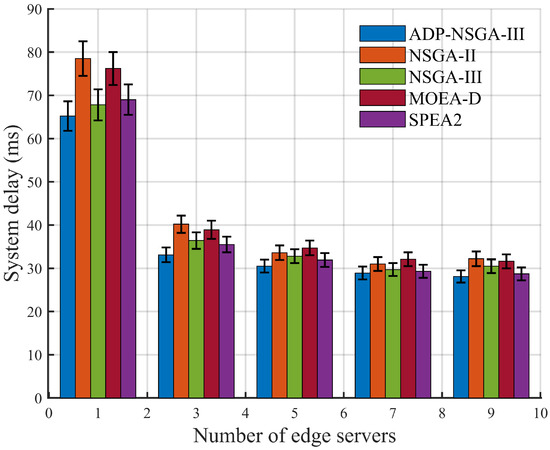 Figure 12 shows a comparison of system delay among different optimization schemes under varying numbers of edge servers (data represents the mean and standard deviation from 30 independent runs). As shown in the figure, system delay decreases as the number of edge servers increases. The ADP-NSGA-III optimization scheme proposed in this paper consistently maintains lower delay than other schemes, demonstrating a significant advantage. Specifically, when the number of edge servers is 5, the delay of ADP-NSGA-III is 30.5 (±1.5), while the delays of other schemes are as follows: NSGA-II is 33.6 (±1.7), NSGA-III is 32.8 (±1.6), MOEA-D is 34.7 (±1.7), and SPEA2 is 31.9 (±1.6). Under this configuration, the delay of ADP-NSGA-III is reduced by 9.23%, 7.01%, 12.10%, and 4.39% compared to NSGA-II, NSGA-III, MOEA-D, and SPEA2, respectively.