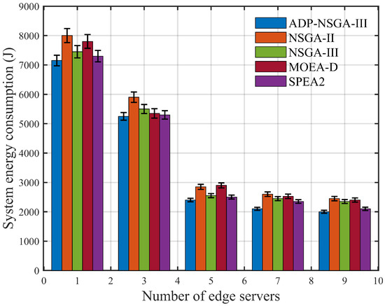 Figure 13 shows a comparison of system energy consumption among different optimization schemes under varying numbers of edge servers (data represents the mean and standard deviation from 30 independent runs). As shown in the figure, system energy consumption decreases as the number of edge servers increases. The ADP-NSGA-III optimization scheme proposed in this paper consistently maintains lower energy consumption than other schemes, demonstrating a significant advantage. Specifically, when the number of edge servers is 5, the energy consumption of ADP-NSGA-III is 2400 (±60), while the energy consumption values of other schemes are as follows: NSGA-II is 2850 (±86), NSGA-III is 2550 (±71), MOEA-D is 2900 (±87), and SPEA2 is 2500 (±67). Under this configuration, the energy consumption of ADP-NSGA-III is reduced by 9.23%, 7.01%, 12.10%, and 4.39% compared to NSGA-II, NSGA-III, MOEA-D, and SPEA2, respectively. This is because as the number of edge servers increases, the distributed availability of computing and storage resources improves, enabling tasks to be executed closer to the end nodes, thereby reducing energy consumption from long-distance transmission and alleviating energy costs caused by excessive loads. When the number of edge servers reaches five, resource supply and task demand reach a relative balance, allowing the algorithm to maximize resource utilization and optimize task paths, resulting in particularly significant energy consumption advantages compared to other solutions.