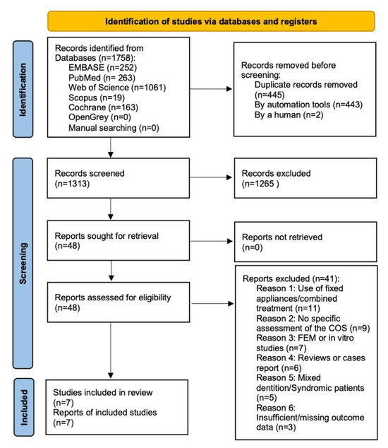 The electronic database search yielded a total of 1758 records, identified from Embase (n = 252), PubMed (n = 263), Scopus (n = 19), Cochrane Library (n = 163), and Web of Science (n = 1061). No additional studies were found through the grey literature (n = 0) or manual searching (n = 0). After removing 445 duplicates, 1313 unique articles remained and were screened by title and abstract. During the initial screening phase, 1265 studies were excluded as they were deemed irrelevant to the focus of the review. The remaining 48 full-text articles were assessed for eligibility according to the predefined inclusion and exclusion criteria. Of these, 41 studies were excluded for the following reasons: use of fixed appliances or combined orthodontic approaches (n = 11), absence of specific evaluation of the curve of Spee (n = 9), finite element models or in vitro research designs (n = 7), case reports, reviews or editorials (n = 6), studies conducted on patients with mixed dentition or craniofacial syndromes (n = 5), and insufficient or missing data on outcomes related to the leveling of the curve of Spee (n = 3). Ultimately, seven clinical studies met the eligibility criteria and were incorporated into the qualitative synthesis. A detailed overview of the screening and selection process is illustrated in the PRISMA flowchart (Figure 1).