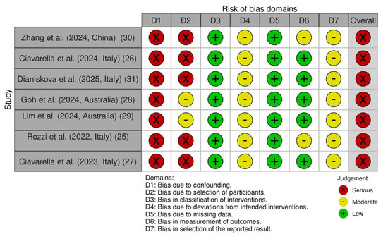 All included studies were rated as having a serious risk of bias according to the ROBINS-I tool, mainly due to confounding, retrospective design and small sample sizes. No study was rated as “low risk” or “moderate risk”. The most frequent sources of bias were related to confounding factors (D1) and the selection of participants (D2), as shown in Figure 2. The high risk of bias is unfortunately common in orthodontic studies, particularly in those involving clear aligner therapy. The nature of the interventions often makes it impossible to blind patients, operators, or outcome assessors, which inherently increases the risk of performance and detection bias.