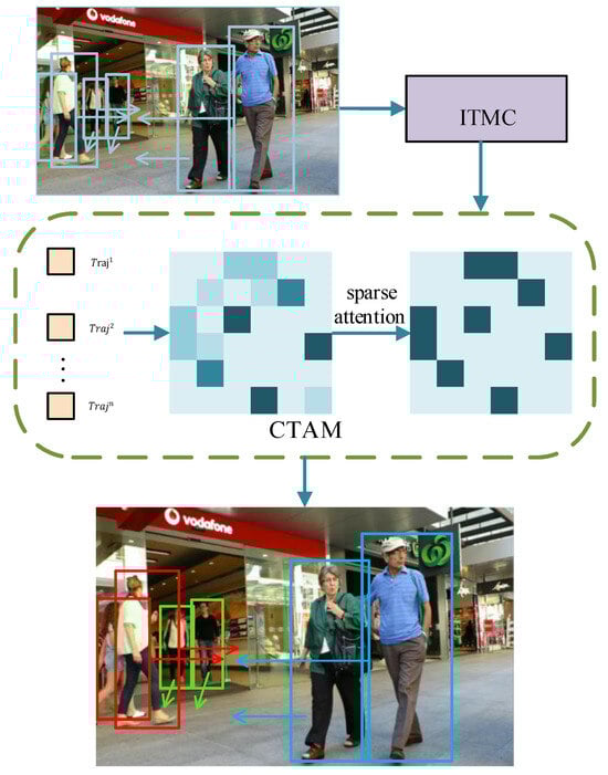 We adopt an absolute bounding-box state representation for each object at time t as , where denotes box center coordinates in pixels, a denotes the box area, r is the aspect ratio, and represents velocities. The standard constant-velocity Kalman model is used with process noise and measurement noise . Throughout, denotes the ITMC prediction (absolute coordinates), denotes the hybrid motion prediction before Kalman correction, and denotes the posterior state after the Kalman update. Unless otherwise stated, all coordinates are absolute in the image frame. When we refer to residuals, these are additive residuals in the absolute state space. The same MLP used in Equation (1) is reused after CTAM to map interaction-aware embeddings to the absolute state space.