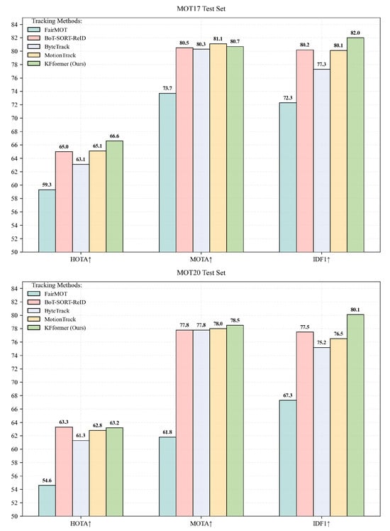 Consequently, the overall theoretical complexity of KalmanFormer is approximately . The model scales linearly with the number of tracked objects M, and its parallel-friendly design ensures that its practical runtime remains efficient, avoiding the quadratic bottleneck of standard transformer architectures. This makes it a highly scalable solution for real-world MOT tasks.