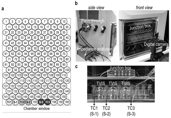 (a) Arrangement of vials on the shelf of the Virtis Advantage Plus XL benchtop freeze-dryer. Three thermocouple-containing vials (labelled TC1, TC2, and TC3) and the three TVIS vials (labelled S-1, S-2, and S-3) were placed in the first row adjacent to the chamber window. The other vials with the numbered position on the shelf were filled with ultrapure water. (b) The Virtis Advantage Plus freeze-dryer equipped with a TVIS system comprises a five-channel TVIS junction box inside the freeze-dryer and an impedance analyzer outside the freeze-dryer. The signal from the junction box is sent and received via the pass-through installed on the manifold hose of the Virtis Advantage Plus XL freeze-dryer. A digital camera was set to observe the nucleation event of the sample-filled vials. (c) The image demonstrates the position of thermocouple vials and TVIS vials containing each sample solution positioned on the freeze-dryer shelf.