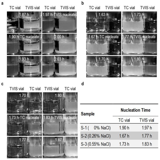 Visual evidence of nucleation in sucrose–salt solution captured by time-lapse photography, (a) 5% sucrose solution, (b) 5% sucrose with 0.26% NaCl, (c) 5% sucrose with 0.55% NaCl (d) Table providing the nucleation times for the three solutions, as recorded by visual observations and observations of the inflections in TVIS parameters.
